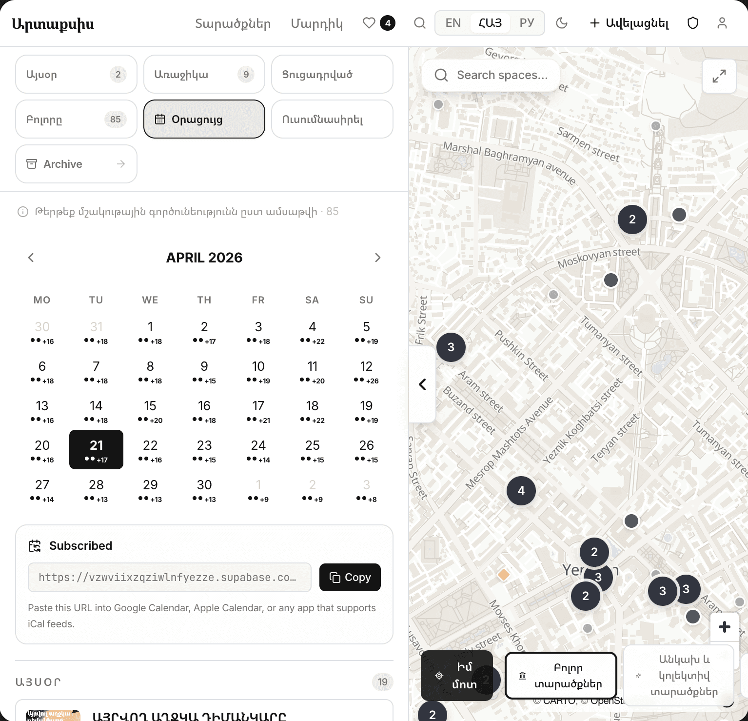 My first attempt at organizing the connective space was a telegram announcements channel. I thought it would be a great thing for newcomers to the scene and the city, a useful planning tool for organizers, and also an archive. While it is all of those things, it’s quite hard to manage — I still have to keep tabs on 25+ social media pages. The complexity has just shifted from all the people doing the discovery work to me, and I get too lazy with it from time to time. I’m also not alone — Sona Arsenyan and Catherine Chernova have similar channels, Vigen Galstyan has a column, and I’m sure there are many more I don’t know about. The next attempt was a shared Google Calendar, where the organizers would post events for visitors to receive via notifications. It also kinda works, but few organizers have joined the initiative consistently, and it’s impossible to gather any data if it’s even doing a good job.