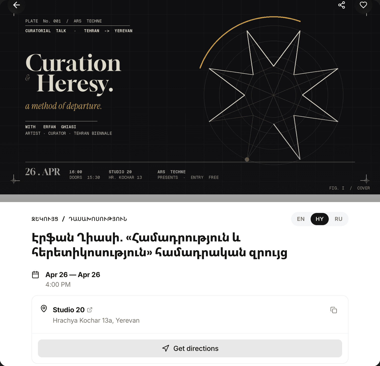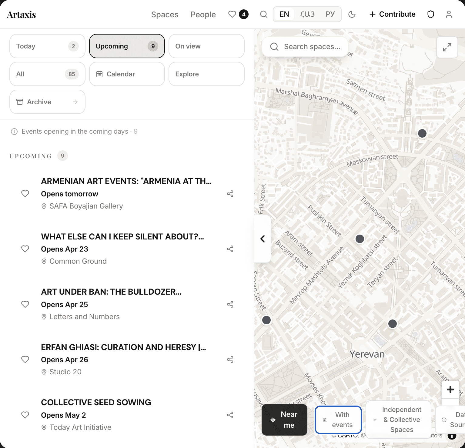 The platform is community-driven. Users can contribute events, expand profiles, and actively shape the ecosystem itself by adding people, collectives, and spaces that may otherwise remain invisible. There is also a review layer that allows visitors to leave feedback and share experiences, adding a qualitative dimension to the archive as it grows. In this way, Artaxis not only aggregates information, it also accumulates perspectives. It also builds on ongoing research initiatives such as the Independent Art Spaces Index Yerevan, making visible both active and dormant infrastructures of the scene. Designed for accessibility and immediacy, Artaxis can be installed directly from the browser to a mobile home screen, offering an app-like experience without requiring download from the App Store or Google Play, where it is not yet available.