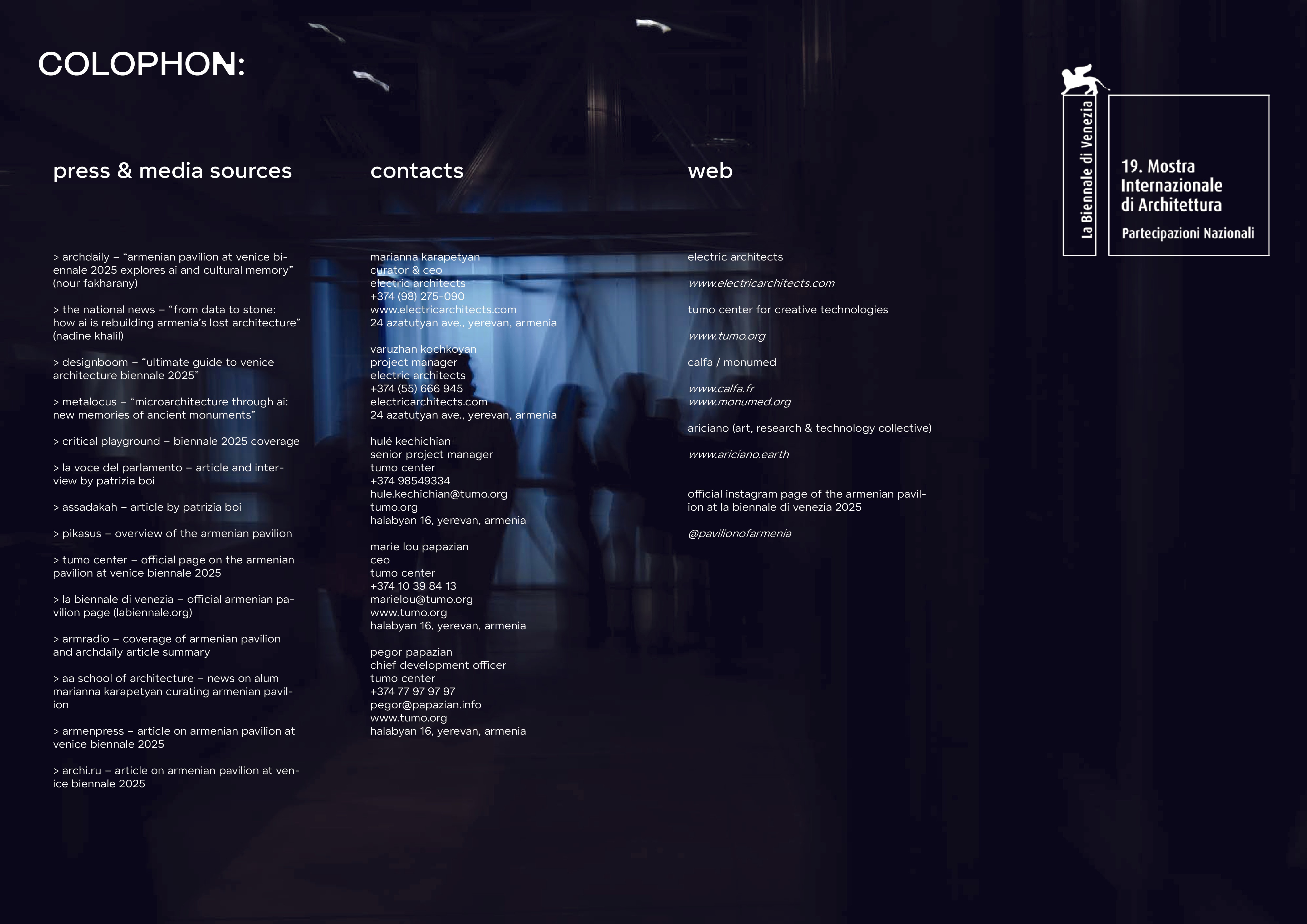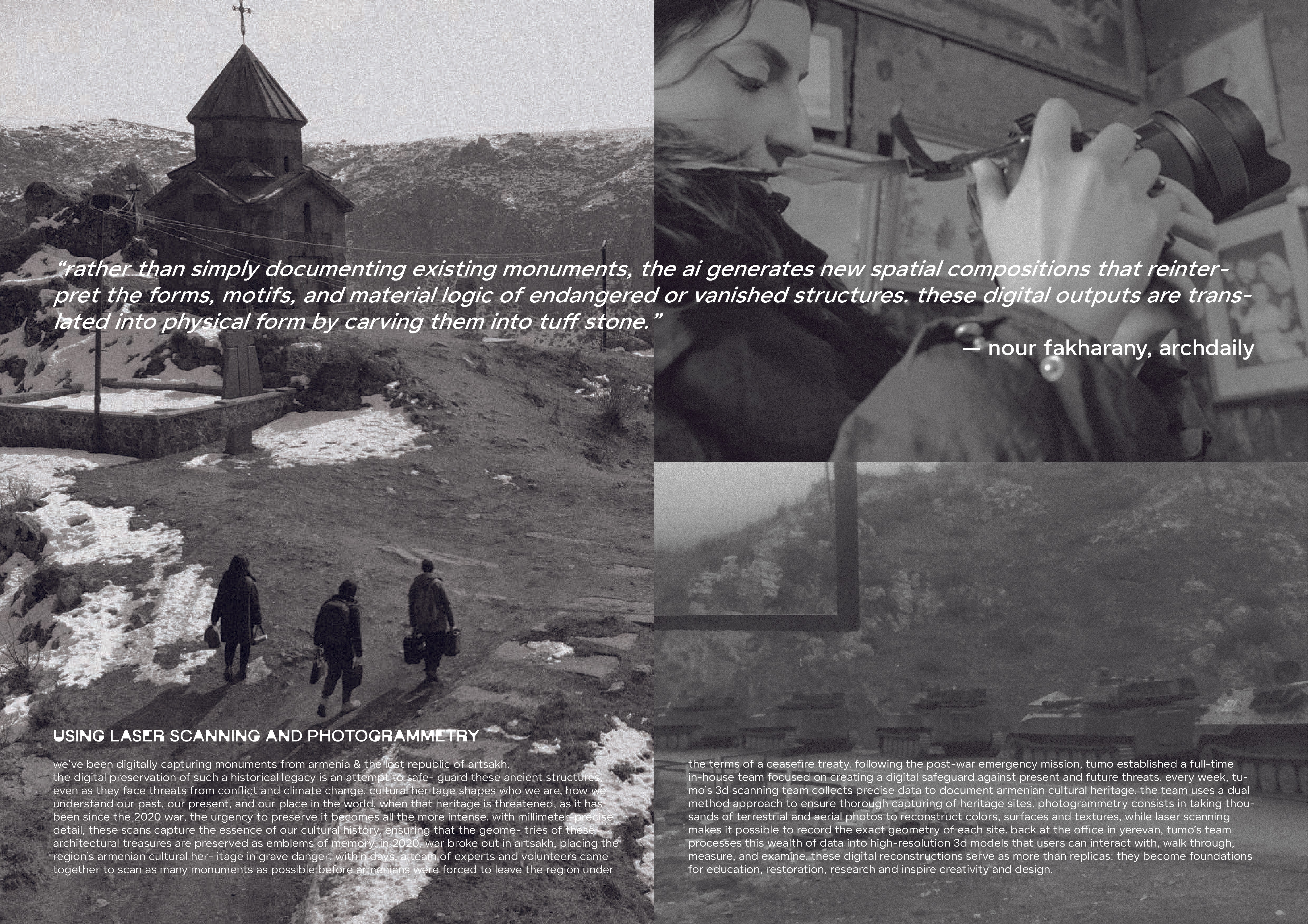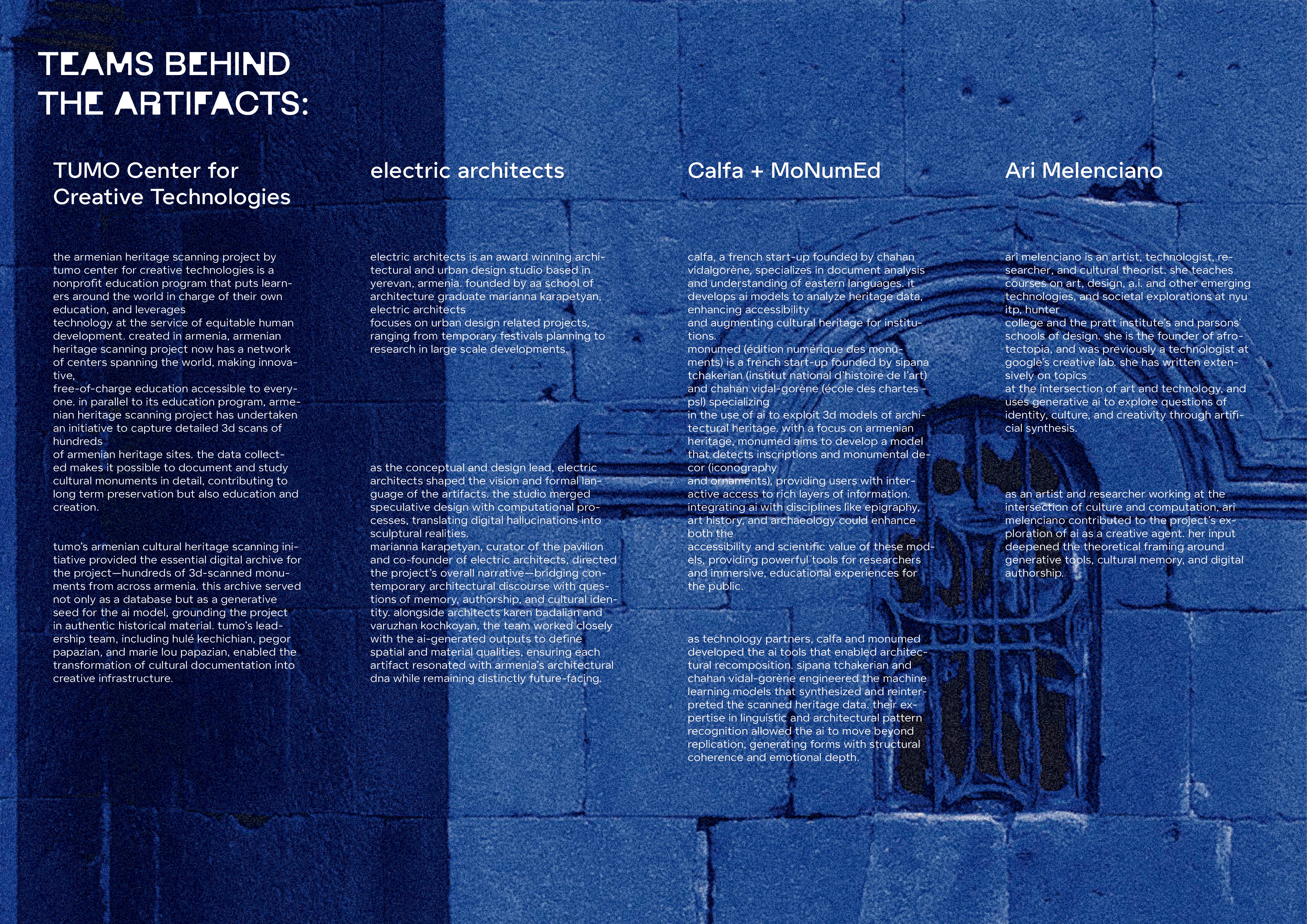 This interdisciplinary project is led by curator Marianna Karapetyan and brings together a team of architects, researchers, and technologists from Electric Architects, TUMO Center for Creative Technologies, CALFA, and MoNumEd.