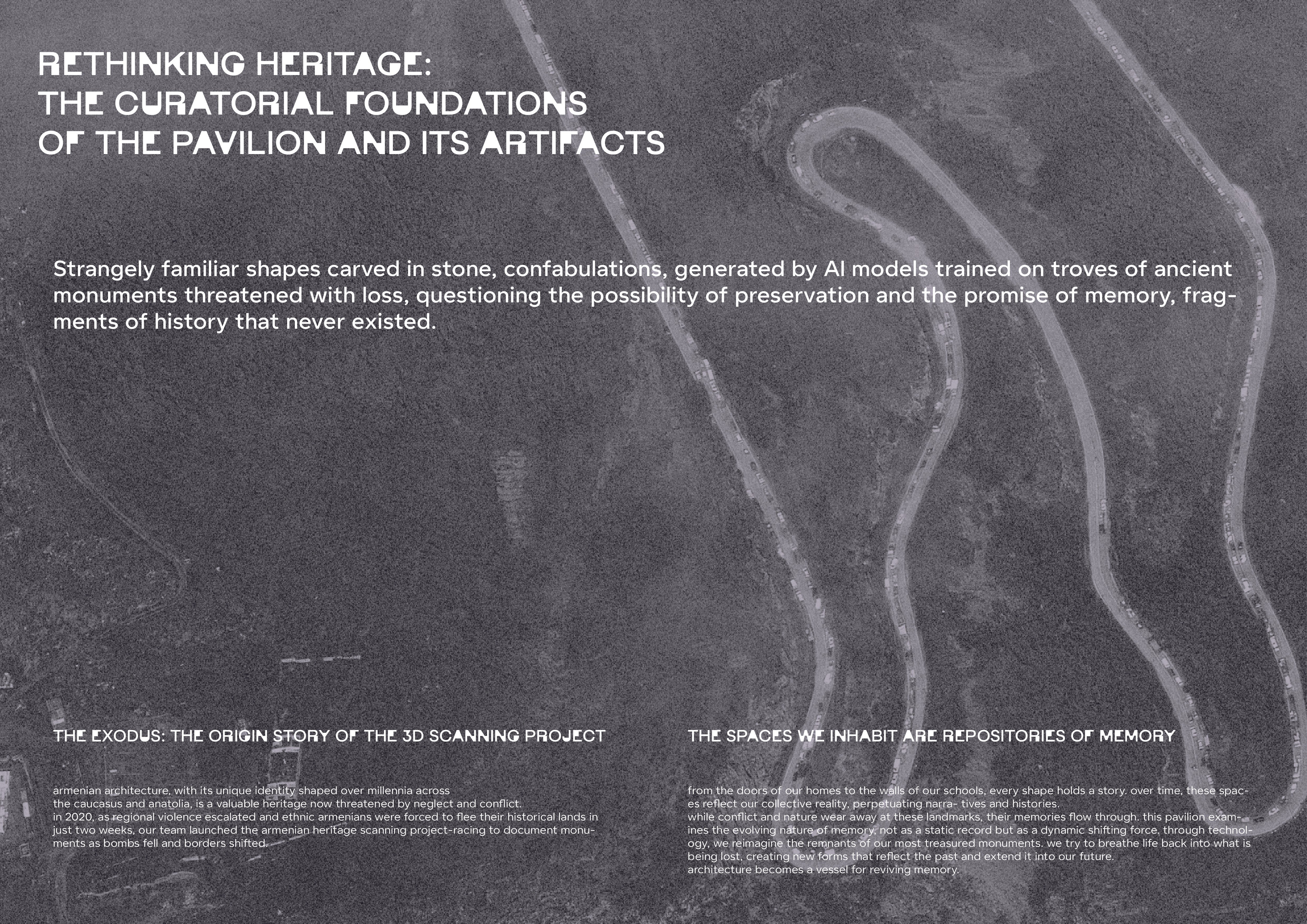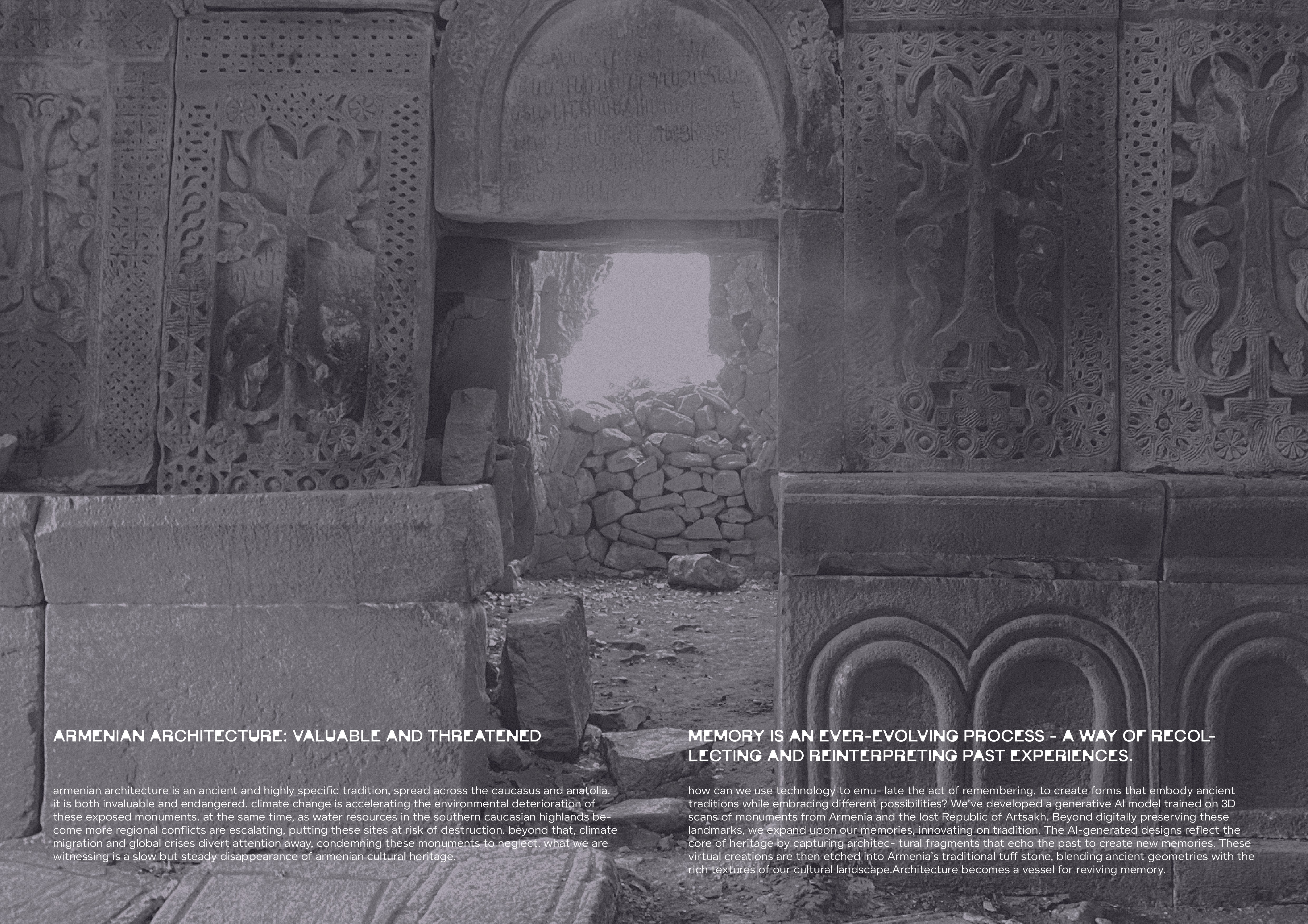 AI in design is often viewed as a tool for optimization—streamlining processes, enhancing efficiency, and amplifying productivity. However, the Armenian Pavilion takes a different approach. Here, AI is leveraged not for its effectiveness, but for its potential to introduce novelty, generating new forms, anomalies, and surprising variations. As AI interprets and reimagines architectural memory, it mirrors and subverts our biases, cultural influences, and histories. It offers a glimpse into how technology can shape our evolving understanding of identity and place, inviting reflection on the complex relationship between tradition and innovation, consequently AI becomes a catalyst for rethinking not just design, but the very act of perpetuating architectural traditions in the face of heritage loss.