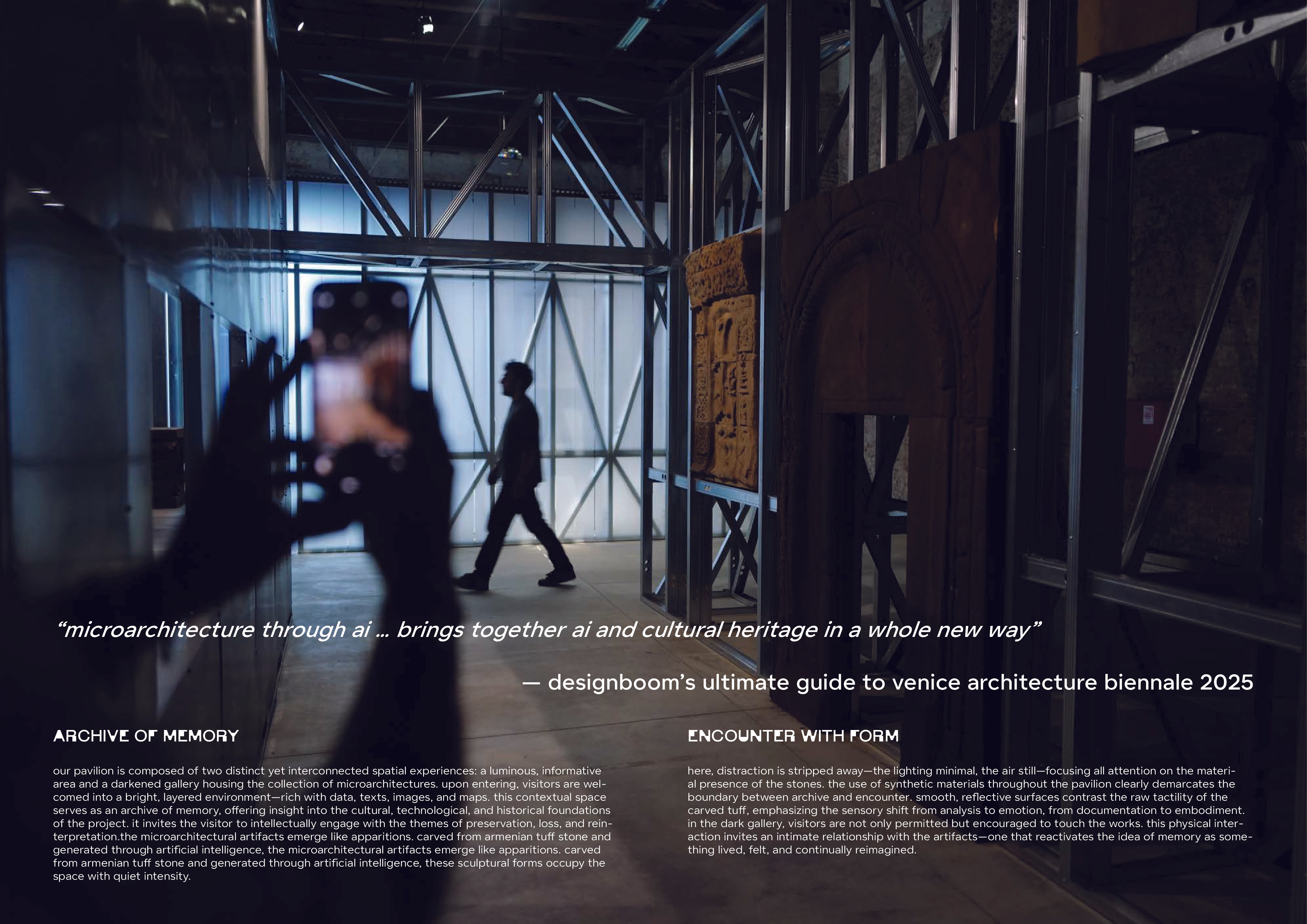 For the 19th International Architecture Exhibition – La Biennale di Venezia, the Republic of Armenia presents “Microarchitecture Through AI: Making New Memories with Ancient Monuments.”