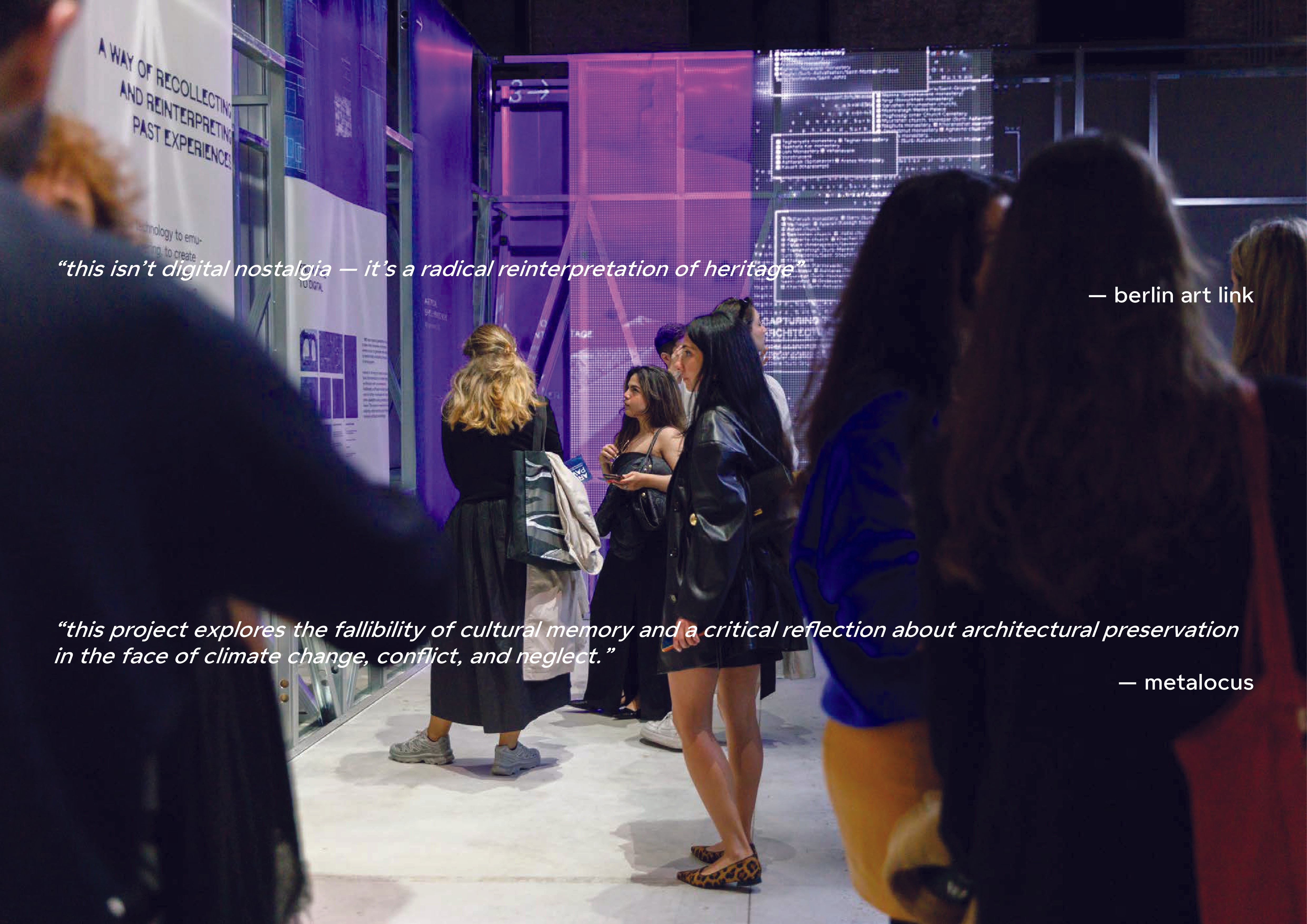 This innovative project explores the fallibility of cultural memory and offers a critique of architectural preservation in the face of loss of heritage due to climate change—through environmental stress, climate-induced conflict, and societal neglect driven by adaptation struggles. The exhibition questions how emerging technologies can expand our understanding of architectural memory, pushing beyond mere preservation to create new, living forms of cultural expression.