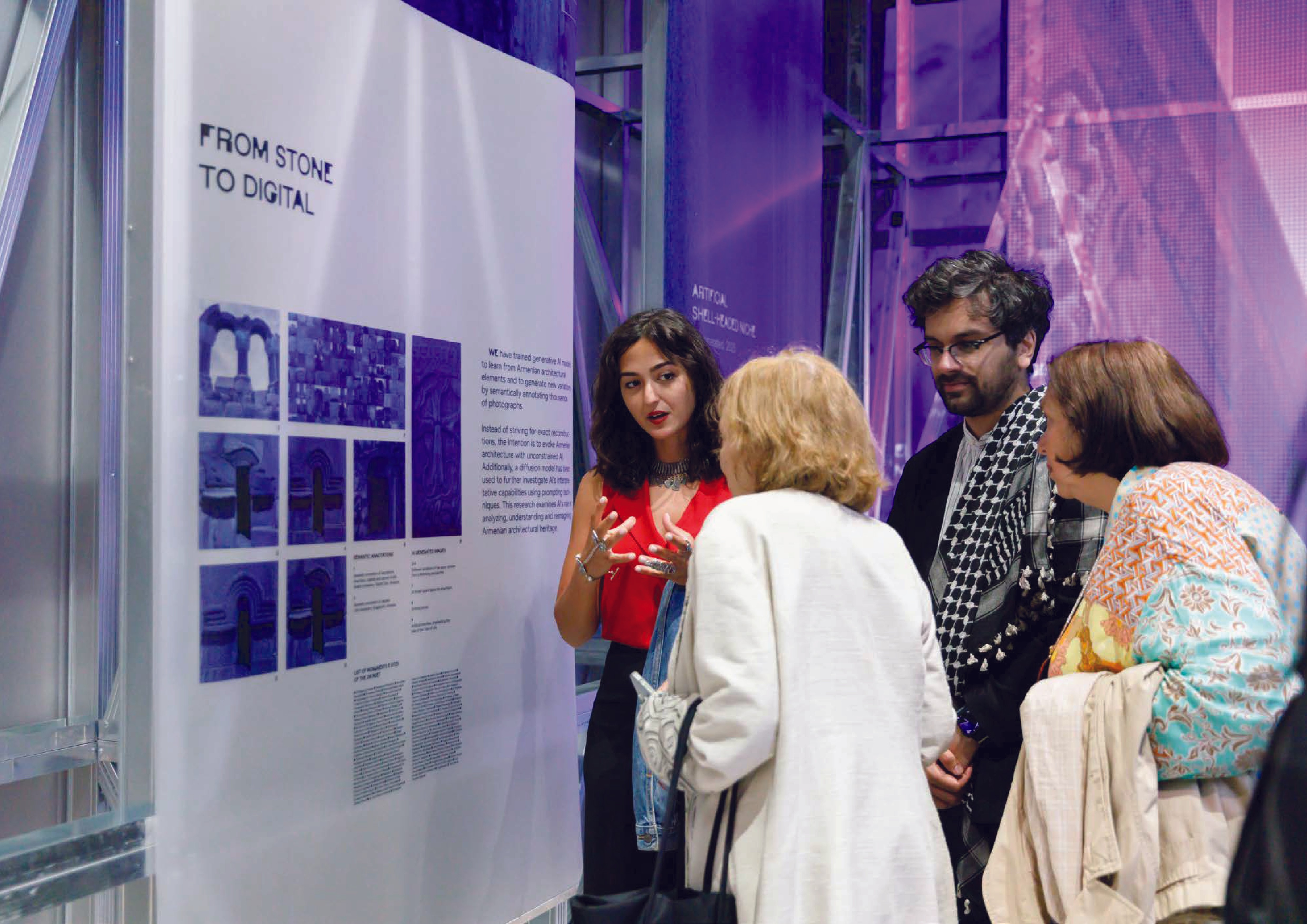 At the heart of the pavilion is a generative AI model trained on the extensive digital archive developed by TUMO’s Armenian Heritage Scanning Project, which has digitized hundreds of ancient Armenian sites using 3D scanning technology. This vast archive is more than a tool for documentation; it serves as a starting point for reexamining traditional notions of preservation and exploring the essence of cultural heritage. Through the integration of AI-driven tools developed by CALFA and MoNumEd, the project investigates how artificial intelligence can reimagine architectural legacy to create new spatial compositions that capture a unique architectural DNA and produce thought-provoking adaptations.