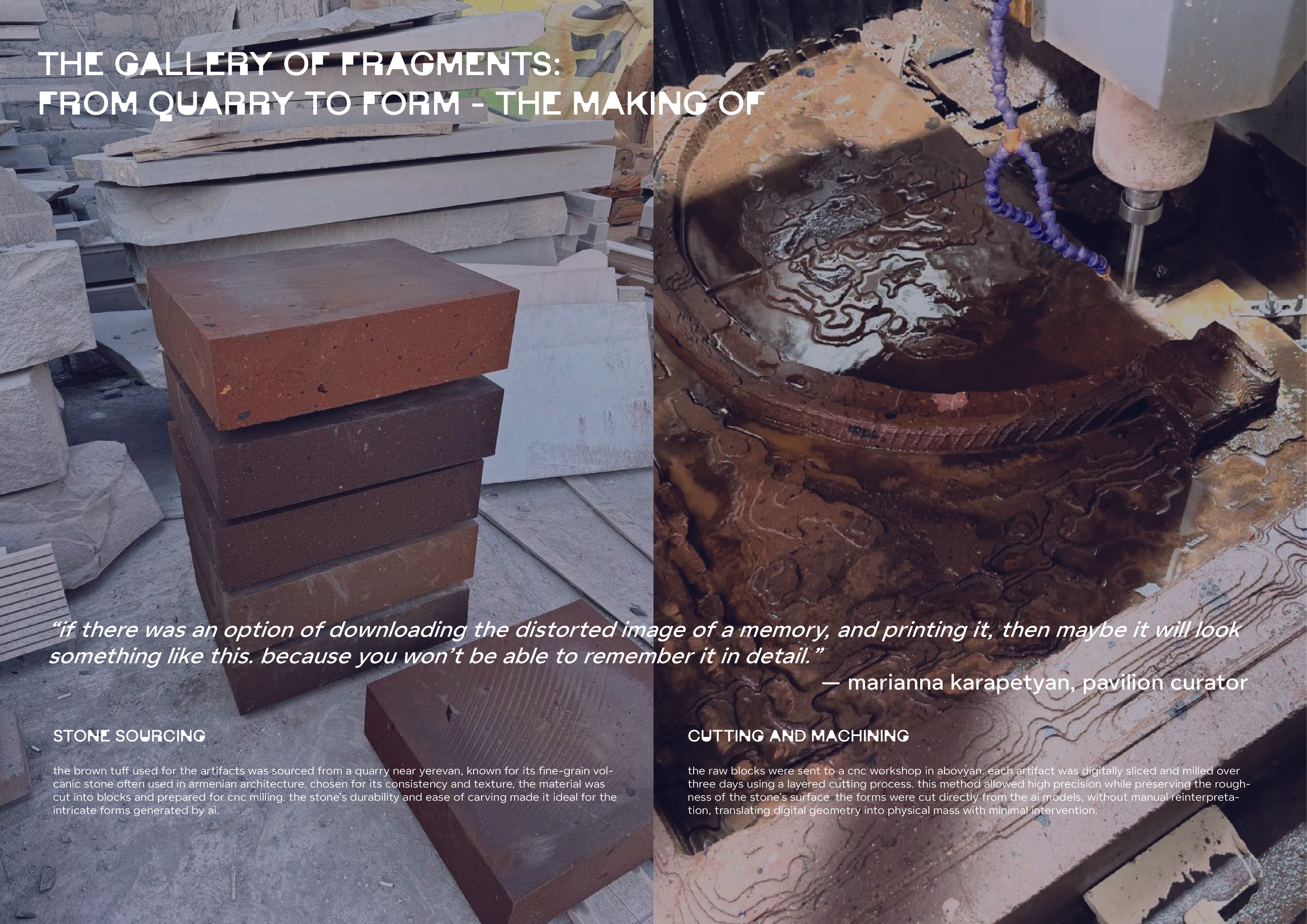 A key highlight of the Armenian Pavilion’s exploration is the transition from the digital to the material. AI-generated designs do not remain confined to virtual space; they are brought to life in tuff stone, the material most closely associated with Armenia’s architectural heritage. This fusion of the digital and the physical underscores the paradox of working with AI: often seen as an abstract, intangible force, here it becomes a tangible reality, grounded in the very material that has shaped Armenian monuments for centuries.